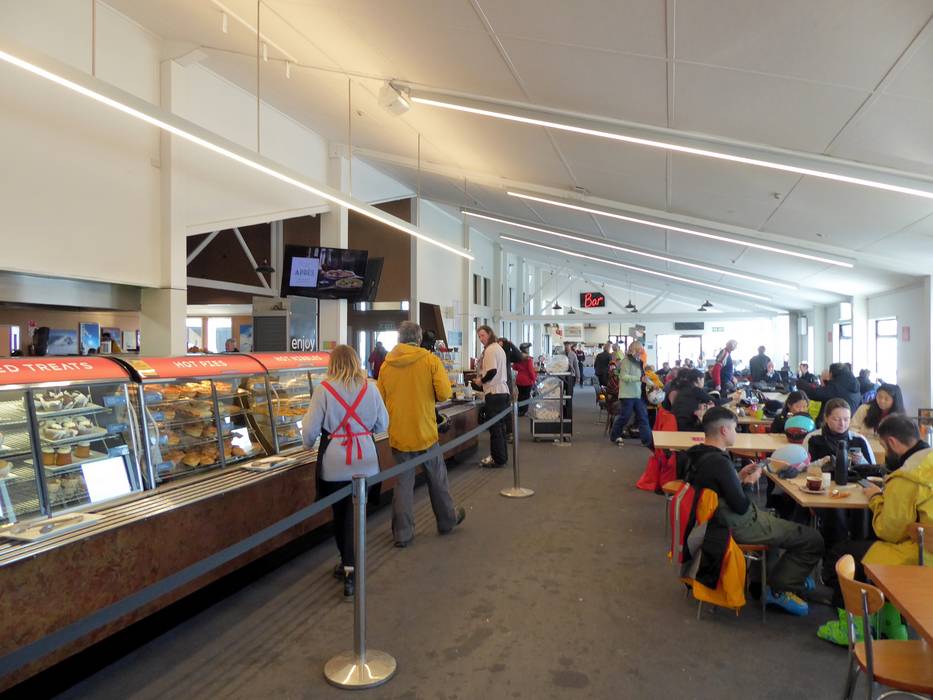 In Treble Cone kann man an der Talstation gut einkehren. Hier warten mehrere Möglichkeiten: Base Café (Frühstück und Snacks), Grab and Go (Pommes, Sandwiches, Salate, Bagels, Gebäck, Kuchen) und The Southern BBQ (sehr gutes und frisch gekochtes Essen). Oben am Berg gibt es noch die Altitude Bar mit Snacks und Getränken und dem wohl besten Ausblick in Neuseeland.