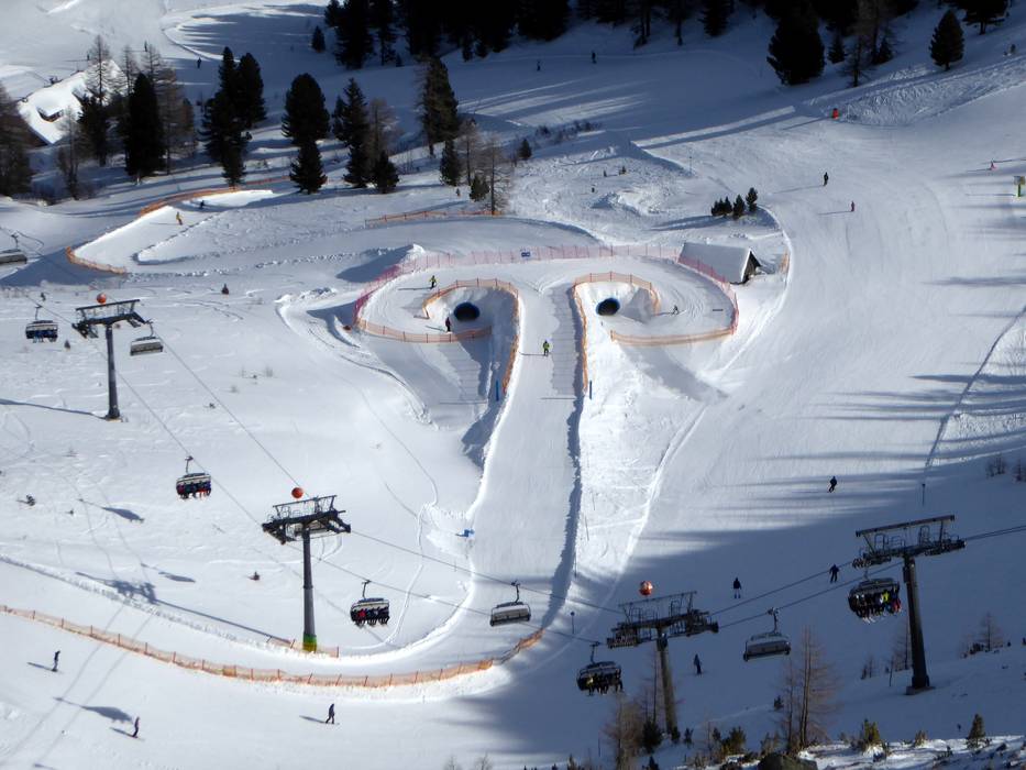 Die Funslope verläuft parallel zum Snowpark. Mit Wellenbahnen, Sprüngen, Steilkurven, Hindernissen, Tunnels und einer Doppelschnecke ist Spaß für jedermann garantiert.