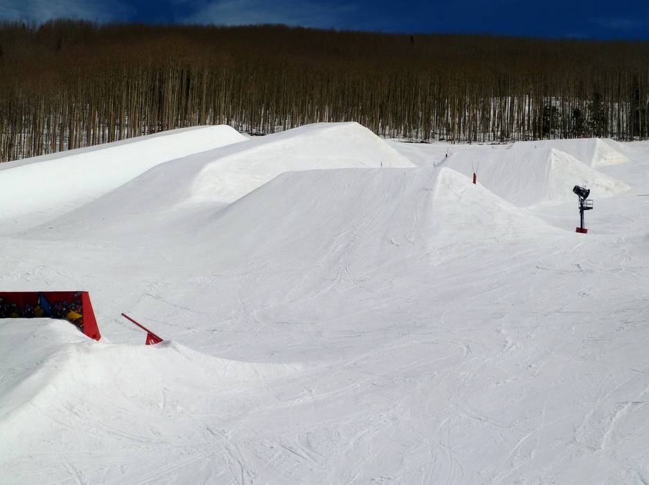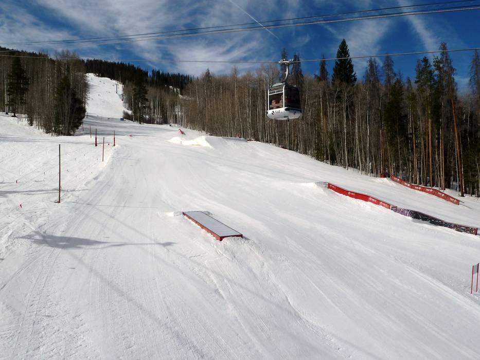 Der Golden Peak Terrain Park ist der größte Park in Vail und bietet auch eine Superpipe. Leicht zu erreichen mit dem Riva Bahn Express. Man kann an der Mittelstation aussteigen und ist direkt im Park.