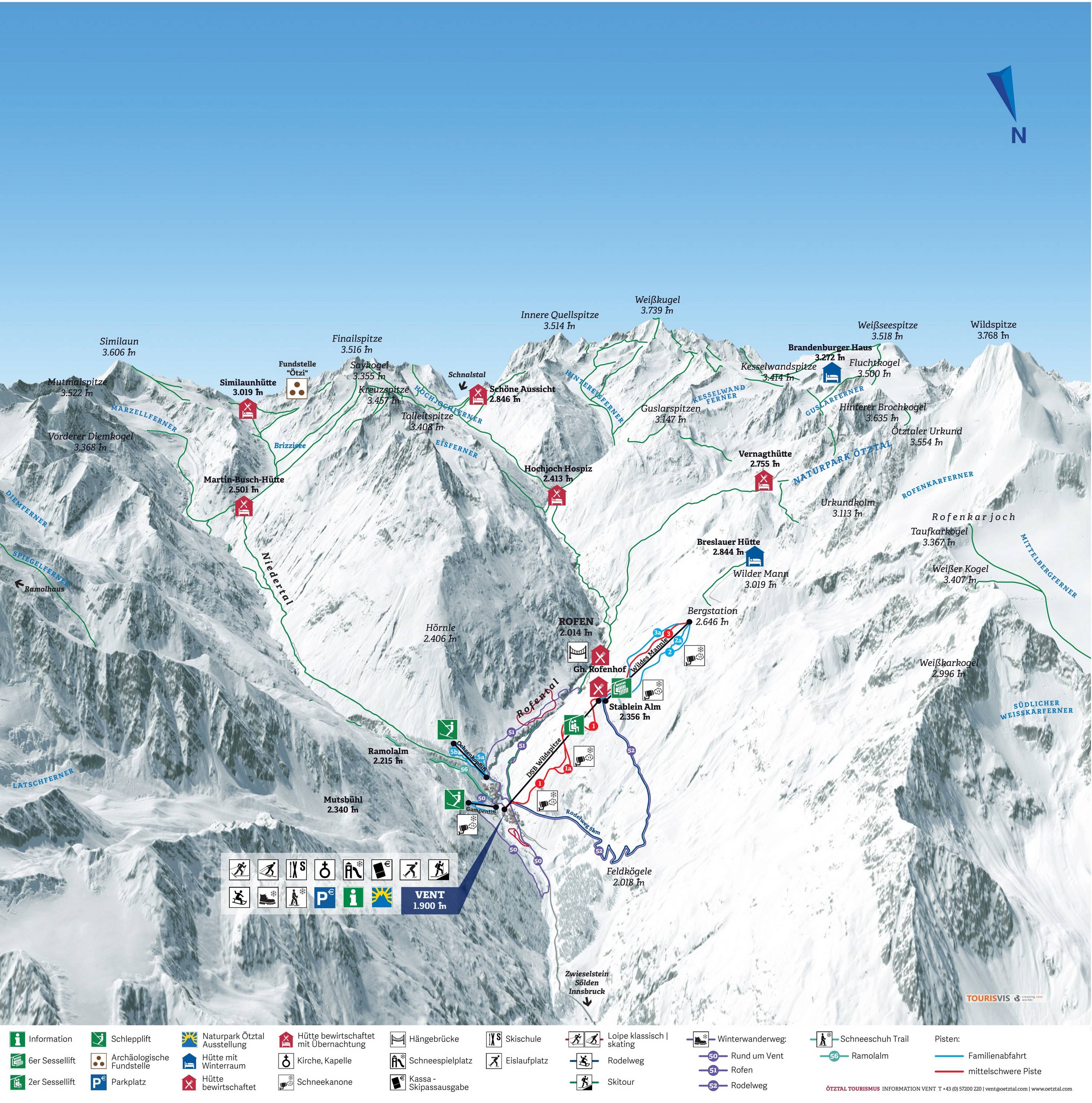 Der Pistenplan stellt das Skigebiet Vent sehr gut dar. Es sind alle Lifte und Pisten eingezeichnet. Zusätzlich findet man Informationen über den Rodelweg, die Loipen und die Winterwanderwege.