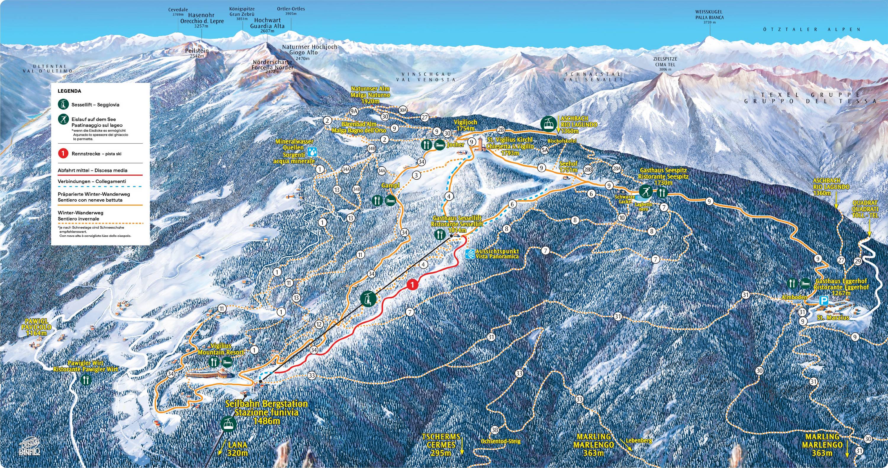 Der Pistenplan stellt das Vigiljoch mit allen Pisten, Liften, Rodelbahnen und Wanderwegen dar. Teilweise ist unklar in welche Richtung die Pisten und Lifte führen. Die beiden Tellerlifte Jocher und Seehof treffen sich an der Bergstation. Für Wanderer sind einige Wandervorschläge mit angegeben. Auf der Rückseite findet man Informationen zu den Einkehrmöglichkeiten und Fahrpläne.