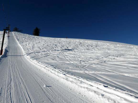 Ein kurzes steiles Stück auf der Talabfahrt und ab und zu die Möglichkeit in den Tiefschnee zu fahren, freuen die Könner. Das Angebot ist aber begrenzt.