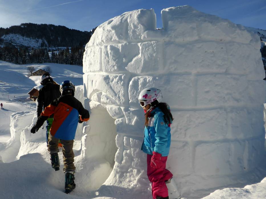 Die riesen Toggenburg, gebaut aus Schnee und Eis, liegt in Oberdorf (Wildhaus) und ist ein Spaß für die Kinder.