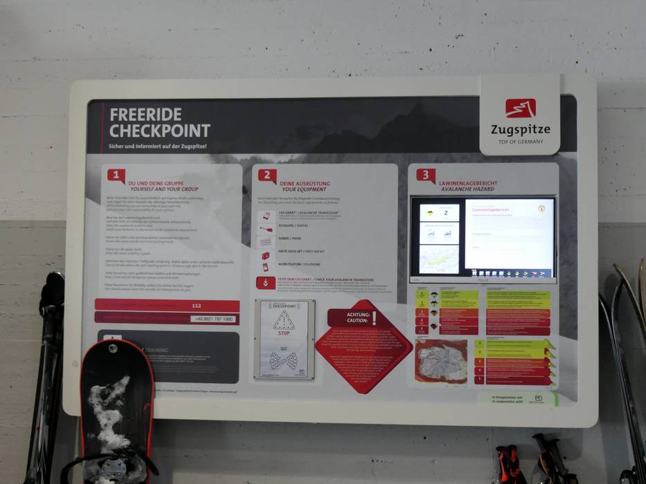 Auf der Zugspitze gibt es keine offiziellen schweren Abfahrten. Bei entsprechender Schneelage finden sich jedoch viele ungesicherte Tiefschneehänge. Dazu gibt es am Gletscherbahnhof auch Freeeridecheckpoints, wo der Lawinenlagebericht bereit steht sowie die VS-Geräte auf ihre Funktion geprüft werden können.