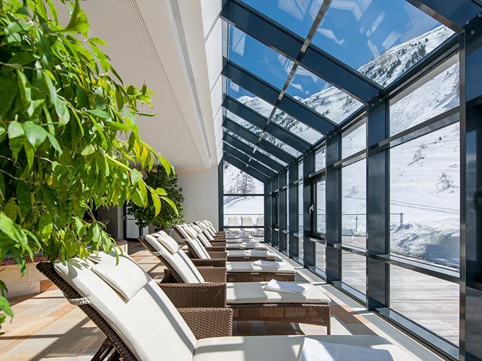 Zur Erholung nach erlebnisreichen Tagen lädt das Skihotel im Ötztal in seinen 1.300 m² großen Spa-Bereich ein: Hier stehen den Hotelgästen ein 14 m langes Schwimmbecken sowie zwei Whirlpools zur Verfügung.