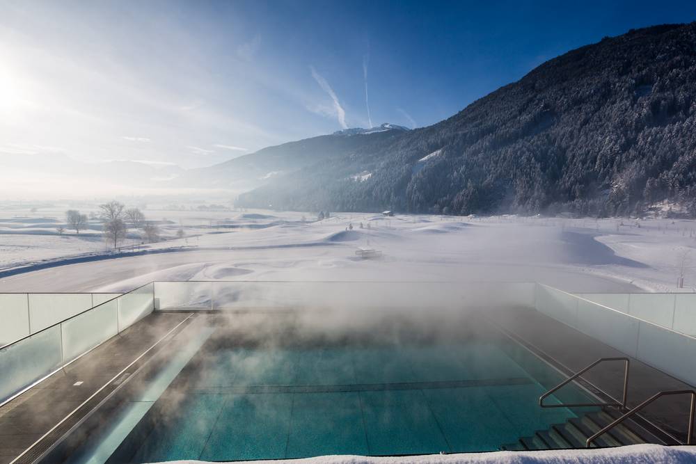 Die Sportresidenz Zillertal****S am Areal des Golfplatzes in Uderns ist eine kleine Luxuswelt für sich. Im Winter liegen Langlaufloipen und Winterwanderwege vor der Hoteltüre. Mit dem Hotelshuttle geht’s rasch und unkompliziert ins hoteleigene, mehrfach ausgezeichnete Skigebiet Ski-optimal Hochzillertal Kaltenbach oder zum Spieljoch. Das Boutiquehotel mit seinen 33 Zimmern und Suiten kommt dem Grundbedürfnis nach Freiheit und Natürlichkeit entgegen. Die klaren Formen, die hochwertige Ausstattung und die durchdachten Raumkonzepte machen es leicht, dem Alltag für ein paar Tage zu entschweben. Die Sahnehäubchen obendrauf – auch wegen der Aussicht auf die weißen Spitzen der Zillertaler Alpen – sind die Penthouse Suite (70 m2) mit privater Relaxzone und die Albatros Suite (90 m2) mit Innensauna und zwei Schlafzimmern. Immer „obenauf“ sind in der Sportresidenz Zillertal****S auch alle Wellnessfans: der Spa-Bereich mit dem Namen „Cloud 7“ verspricht wohlige Entspannung in Saunen und Dampfbädern, bei Kosmetikbehandlungen oder Massagen. Zu Schwimmrunden mit freiem Blick auf die Zillertaler Berge lädt der Infinity Pool am Dach.