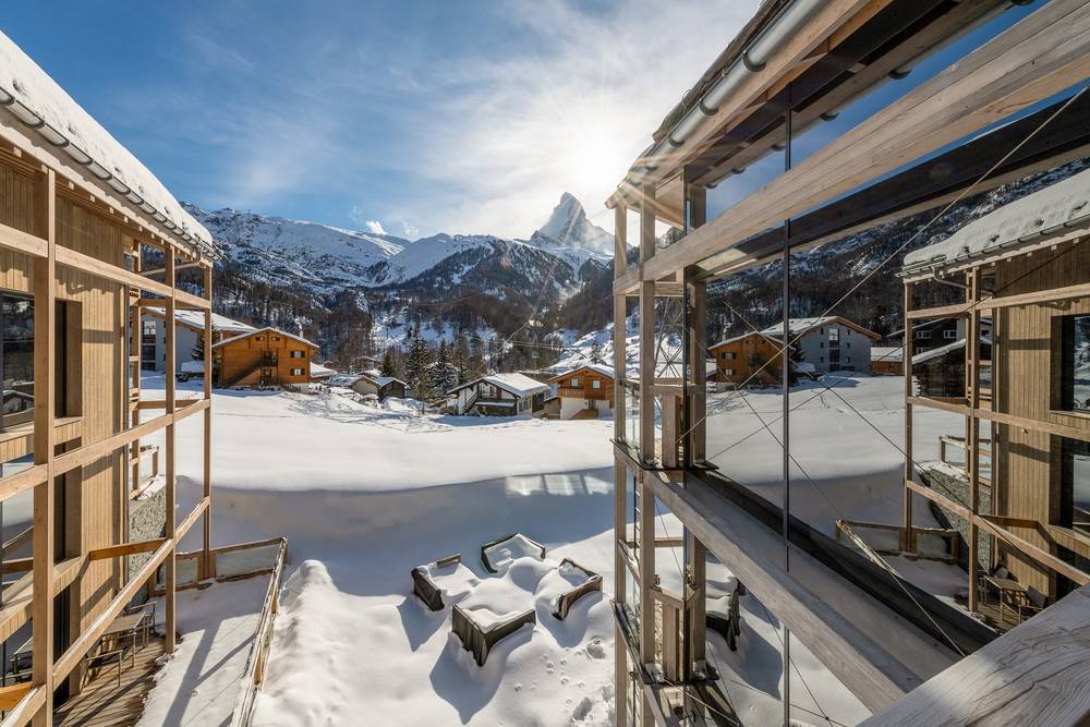 Die Zimmer – ein Erlebnis: 30 Design-Doppel- und Familienzimmer sowie Suiten mit bodentiefen Panoramafenstern, eröffnen den Blick auf die Walliser Bergwelt, - die Meisten davon mit Matterhornblick oder Dorfblick.