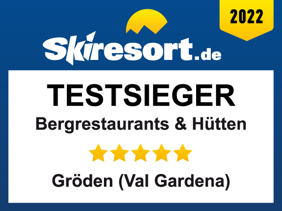 Das Skigebiet Gröden (Val Gardena) wurde von Skiresort.ch, dem weltweit größten Testportal von Skigebieten, als Testsieger 2022 in der Kategorie „Bergrestaurants & Hütten“ ausgezeichnet.