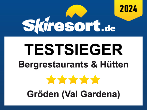 Das Skigebiet Gröden (Val Gardena) wurde von Skiresort.ch, dem weltweit größten Testportal von Skigebieten, als Testsieger 2024 in der Kategorie „Bergrestaurants & Hütten“ ausgezeichnet.