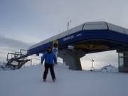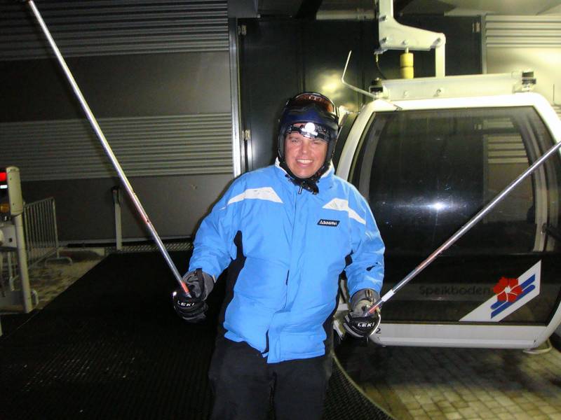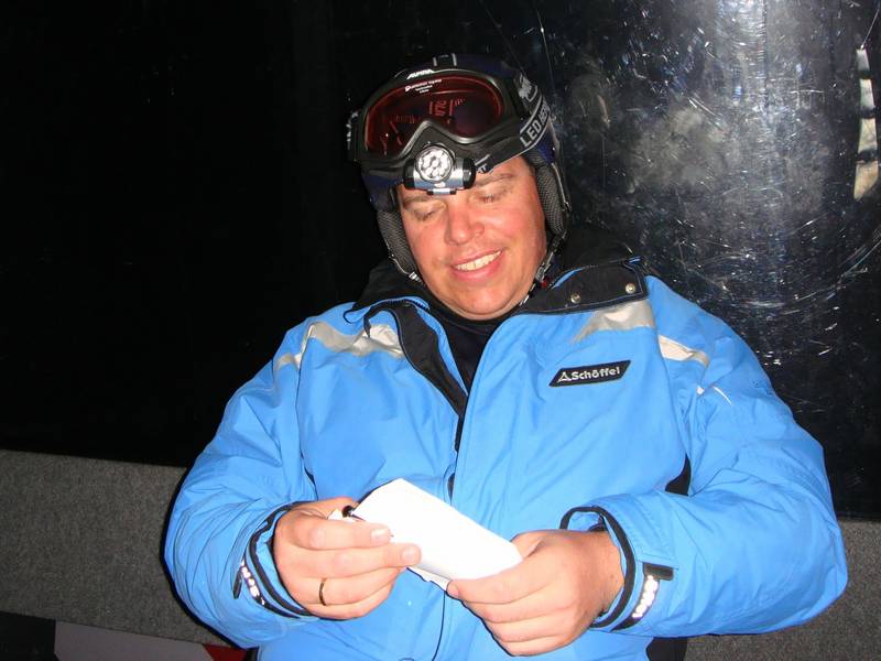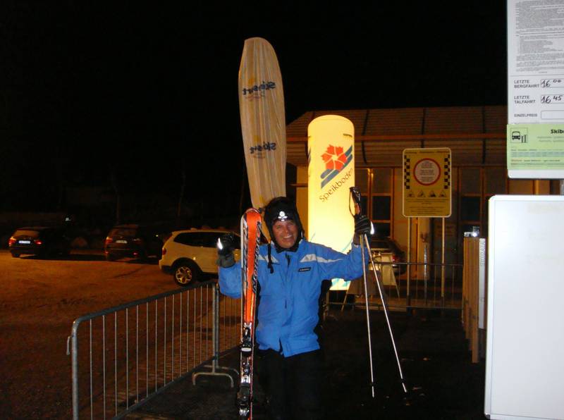 21.42 Uhr: Letzte Auffahrt - gleich fährt Oliver Kern die 5,5 km lange Talabfahrt 58 Mal (zusätzlich zu den weiteren Pisten am Sonnklar). Insgesamt werden dann 361 Pisten-km am Speikboden bewältigt sein. Aufwärts 58 Mal mit der 2.887 m langen Achterkabinenbahn mit einem Höhenunterschied von 1.022 m und ergänzend noch vier Sesselbahnen.