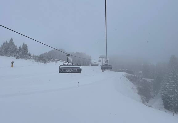 Oliver Kern ist bereit, gemeinsam mit Herbert Gassner vom Skicircus Saalbach Hinterglemm Leogang Fieberbrunn geht es mit der Reiterkogelbahn in Hinterglemm hinauf zur ersten 8er-Sesselbahn des Tages.