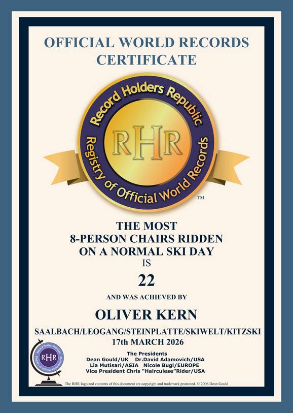 Nachdem Oliver Kern 2025 bereits drei außergewöhnliche Weltrekorde aufgestellt hat – darunter 101 verschiedene Skilifte an einem Tag in Schweden sowie zwei Höhenmeter-Rekorde in der SnowWorld Bispingen in Deutschland – zielt er nun auf seinen zehnten Weltrekord ab. Sein nächstes Ziel: An einem einzigen Tag in den renommiertesten Skigebieten Österreichs mindestens 20 verschiedene 8er-Sesselbahnen zu bezwingen. Als Inhaber und Geschäftsführer des Internetportals Skiresort ist er begeisterter Fan von 8er-Sesselbahnen. Diese äußerst komfortablen und modernen Bahnsysteme findet man nur in wenigen ausgewählten und besonderen Skigebieten weltweit.